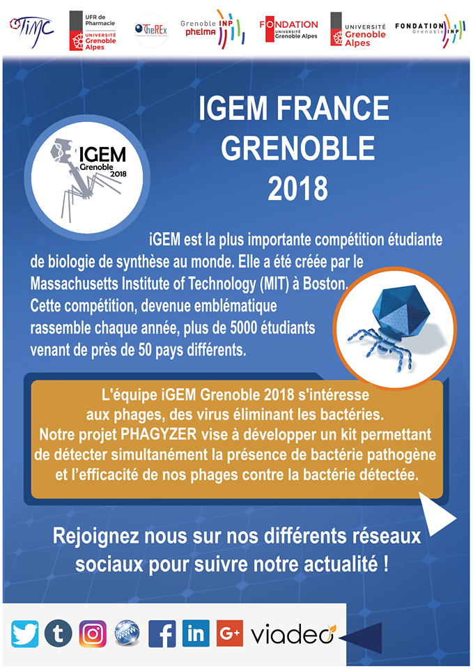 L’équipe iGEM Grenoble 2018 souhaite répondre au problème de l’antibiorésistance en concevant un dispositif compact et rapide détectant des pathogènes. Un autre aspect important du projet est sa vulgarisation scientifique et la sensibilisation à la phagothérapie.